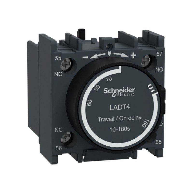 TeSys D – Bloque de contactos auxiliares de temporización para contactores LC1D, LC1F y relés de control CAD. Proporciona contactos 1NO+1NC con clasificación de hasta 10A 690V CA, rango de ajuste de retardo de 10-18s, conexión mediante terminales de borne atornillado. El montaje frontal a presión, proporciona gran fiabilidad y durabilidad. Certificación de estándares múltiples (IEC, UL, CSA, CCC, EAC), cumplimiento de Green Premium (RoHs/Reach).
