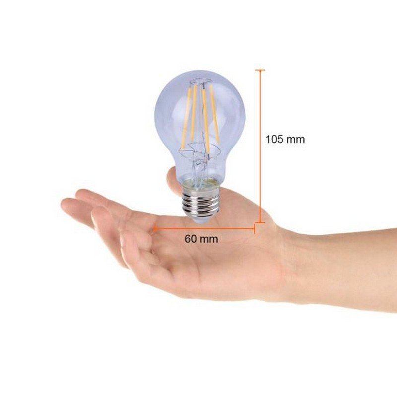Mano sosteniendo una bombilla LED de filamento con medidas indicadas de 105 mm de alto y 60 mm de diámetro, mostrando su tamaño compacto y diseño clásico transparente