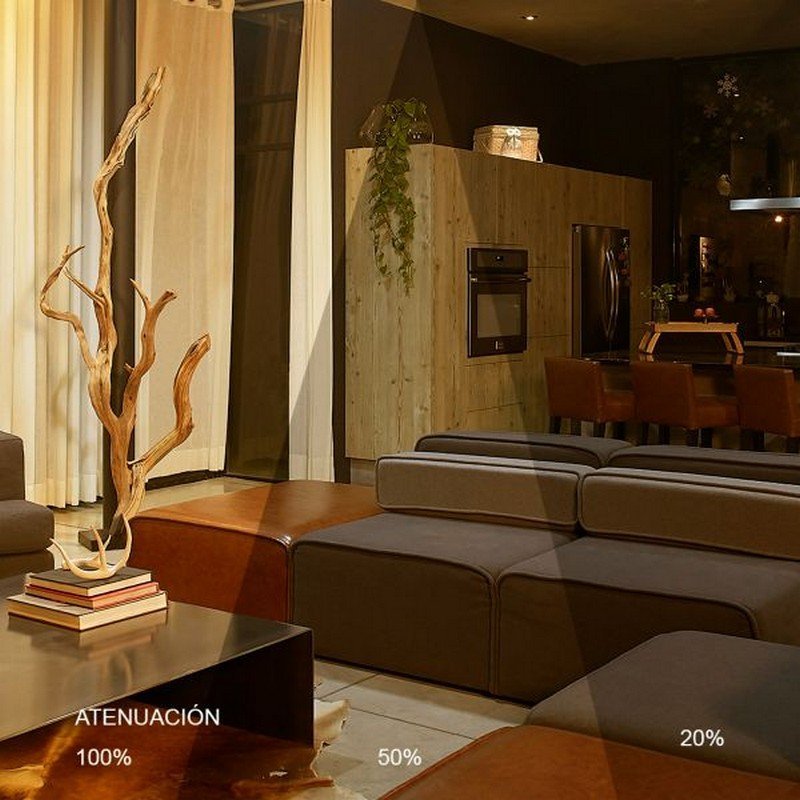 Sala moderna con iluminación cálida y niveles de atenuación mostrados al 100%, 50% y 20%, destacando el efecto de regulación de luz en el ambiente