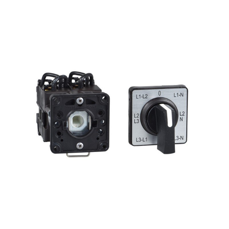 Tiene forma cuadrada y una leyenda metálica con marcado en negro. Es IP65 y se instala en un orificio de 22 mm. Este interruptor de fase del voltímetro ofrece la máxima robustez mecánica y eléctrica de su clase, para un funcionamiento prolongado sin mantenimiento. Su alta protección IP permite manipular paneles en ambientes muy polvorientos y húmedos, incluso al aire libre.