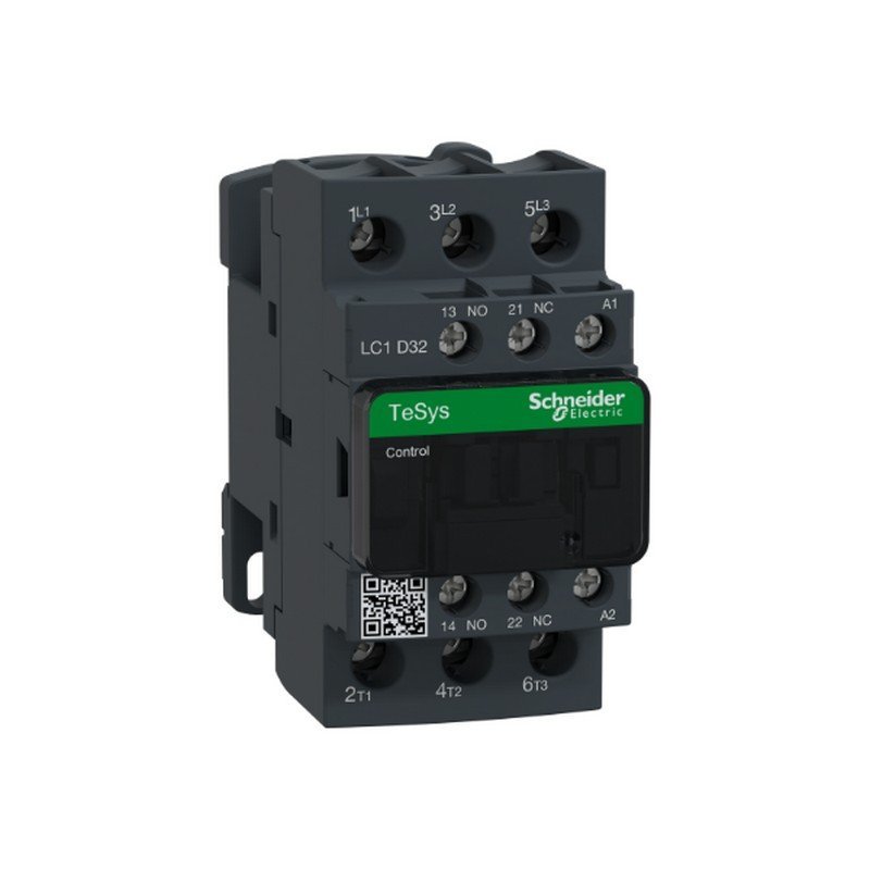 Contactor TeSys D, 3 polos (3NA) para aplicaciones de control de motor de hasta 32A/690V AC-3/3e (15kW@4V). Proporciona una bobina de CA de 220V 50/60Hz, contactos auxiliares integrados 1NO+1NC (certificado para espejo NC), conexión por terminales de borne atornillado. Para velocidades de operación hasta 3600 ciclos/hora y ambientes hasta 60°C, obtiene alta confiabilidad y durabilidad. Compacto (45mm de ancho), montaje en riel DIN o fijación al tornillo. Certificación de estándares múltiples (IEC, UL, CSA, CCC, EAC, Marine), cumplimiento de Green Premium (RoHS/REACh).