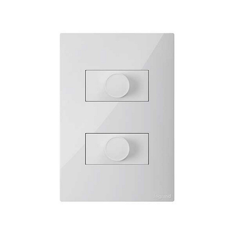 Dimmer de giro doble de la línea ClickMe, en blanco. Diseñado para controlar la intensidad de dos circuitos de luz, ideal para espacios que requieren una iluminación flexible y adaptable.