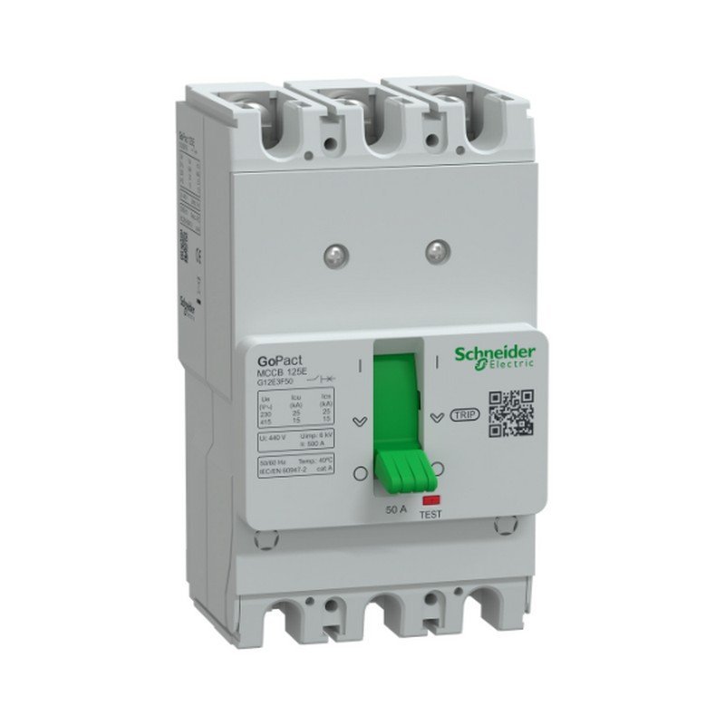 Los interruptores termomagnéticos de caja moldeada GoPact cuentan con la etiqueta Green PremiumTM,la cual promete el cumplimiento de las reglamentaciones más recientes, transparencia sobre los impactos medioambientales, productos circulares y de bajo nivel de CO2. Es una solución sencilla con una calidad robusta y un precio accesible. Diseñado para satisfacer los requisitos de las instalaciones de sistemas eléctricos actuales, en constante evolución. Este dispositivo es un interruptor, o breaker, termomagnético de 3 polos y corriente nominalde 125A. El MCCB GoPact ofrece una buena relación calidad-precio para aplicaciones básicas y garantiza una protección eléctrica fiable para sus aplicaciones. Su poder de corte (Icu) es 15kA rms a 415VAC 50/60Hz. La tensión de operación es 415V AC 50/60Hz. Este breaker incorpora una unidad de disparo termomagnética (TMD) de corriente nominal 50A (In). Esta unidad ofrece una protección térmica regulable Ir (contra sobrecargas) con un rango de ajuste de 0,8xIn a 1xIn (40A-50A). Además, ofrece una protección magnética fija (contra corto-circuitos) definida para 10xIn (500A). El MCCB GoPact dispone de una gran variedad de accesorios opcionales fáciles de elegir e instalar.