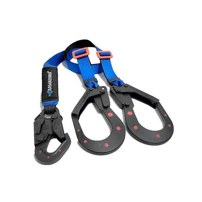 Este mosquetón de mayor tamaño está diseñado para conectarse al punto de anclaje, como una estructura o una línea de vida. Su tamaño mayor facilita la conexión a puntos de anclaje más grandes y robustos. La eslinga incorpora un amortiguador de energía que se despliega en caso de una caída, absorbiendo la fuerza de impacto y reduciendo la carga transmitida al cuerpo del usuario. Esto es crucial para minimizar el riesgo de lesiones graves en caso de un accidente.
