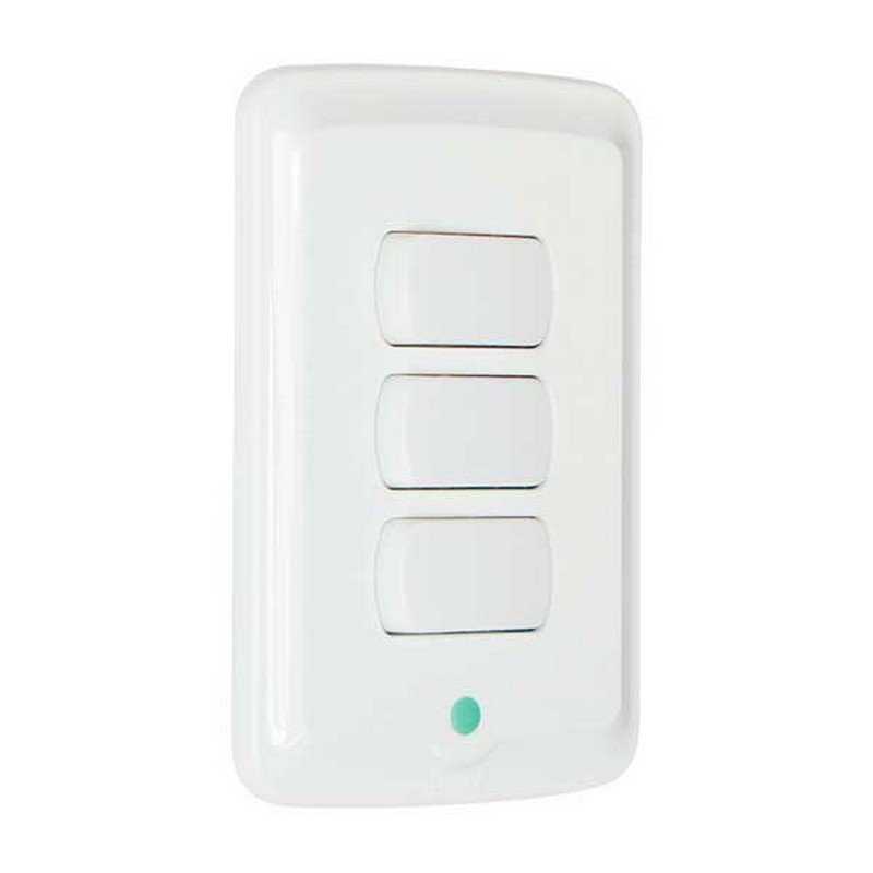 El Interruptor Ambia RF Triple en color blanco permite controlar tres circuitos de iluminación de manera independiente, integrando tecnología de radiofrecuencia (RF) para un manejo más flexible y cómodo.