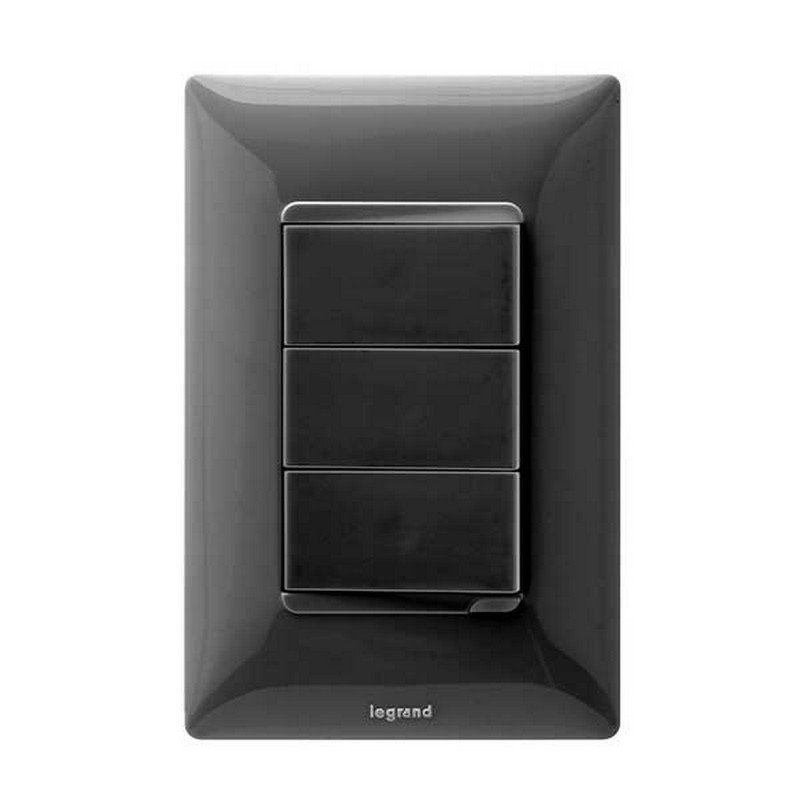Interruptor triple de la línea Futura, en color negro (NG). Este interruptor permite el control de tres circuitos eléctricos desde un solo punto, lo que lo hace ideal para aplicaciones residenciales y comerciales.
