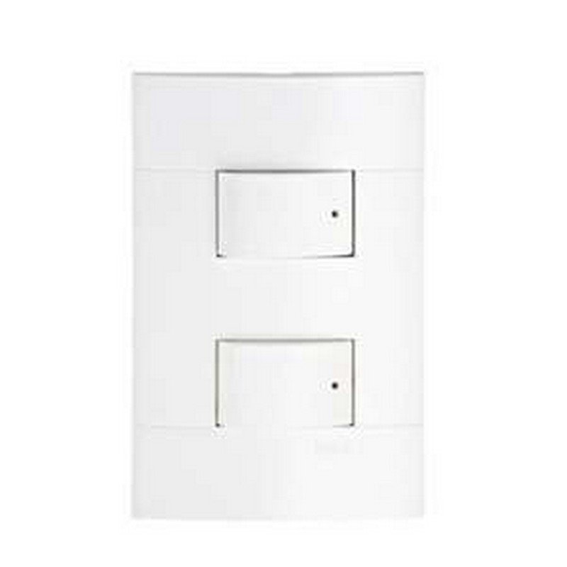Sus dimensiones compactas incluyen una longitud de 123 mm, anchura de 85 mm, altura de 9 mm, y una profundidad total de 33,9 mm, con un fondo empotrado de 24,9 mm. El dispositivo se fija a presión, lo que facilita una instalación rápida y sencilla. Las conexiones se realizan mediante terminales en pilar, compatibles con cables de calibre AWG 8 y secciones de hasta 6 mm². Presentado en un práctico paquete tipo flow-pack, el **Lunare** es una solución confiable para instalaciones de control eléctrico. INTERRUPTOR LUNARE DOBLE BLANCO