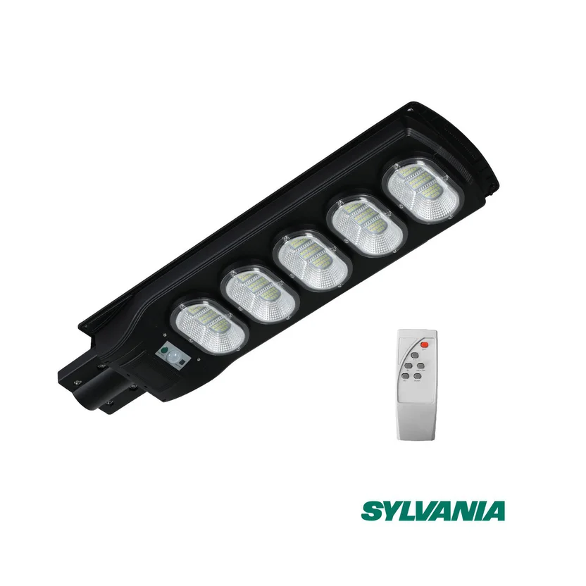 Luminaria solar Sylvania equipada con batería de litio, módulo LED, panel solar monocristalino y sensor de movimiento integrados; Incluye un control remoto que ofrece dos modos de configuración (Modo iluminación constante y modo sensor).