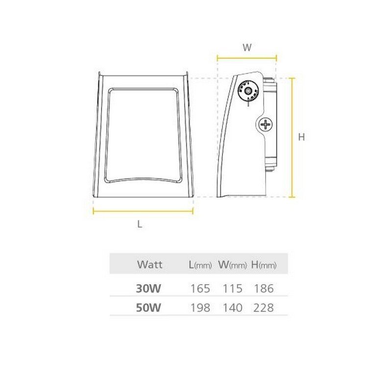 Luminaria LED de 50W para montaje en pared, con diseño robusto en aluminio y óptica sellada, ideal para iluminación exterior eficiente y duradera.